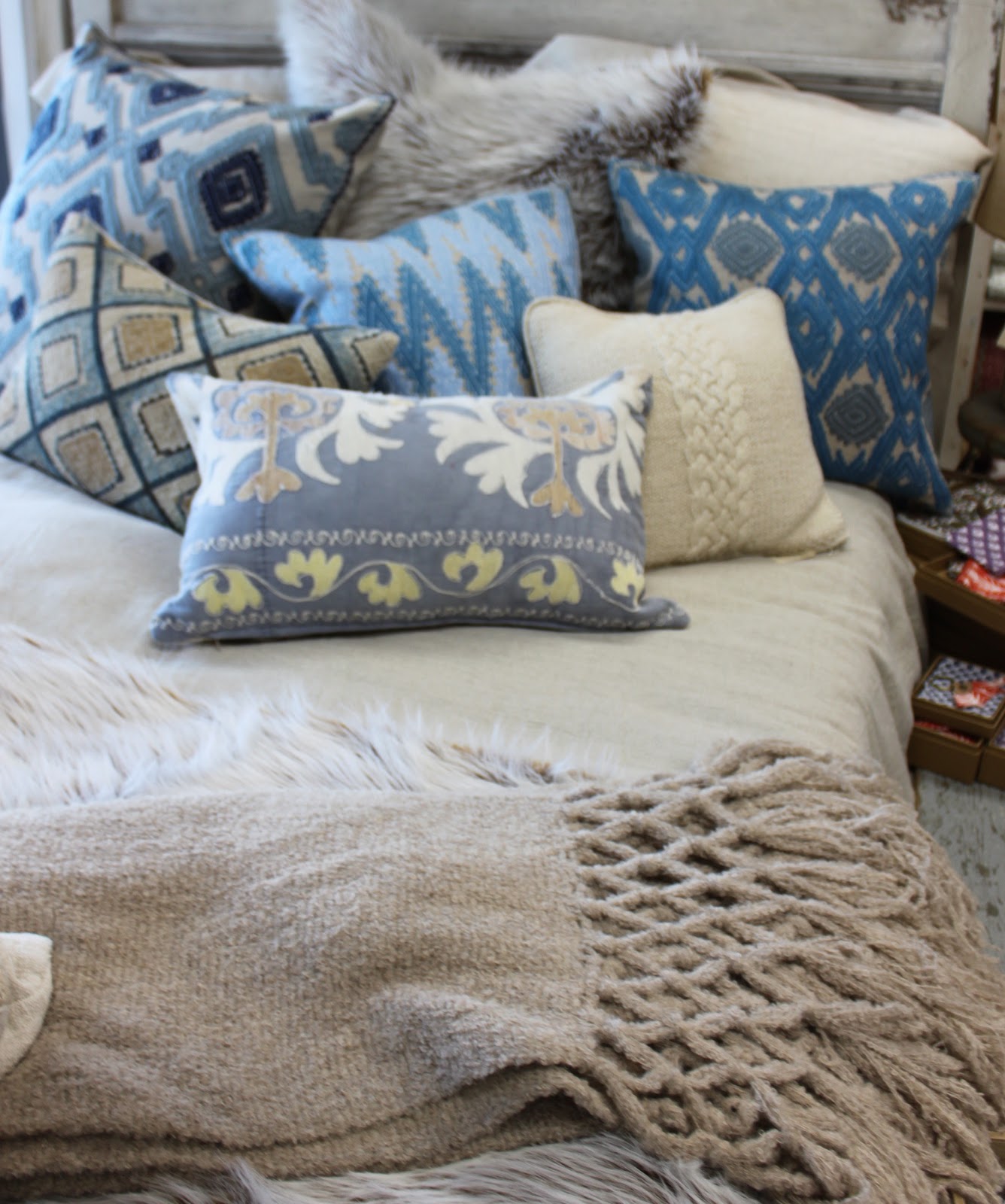 A wool Sefte throw blanket at the end of the bed. Great fringe!